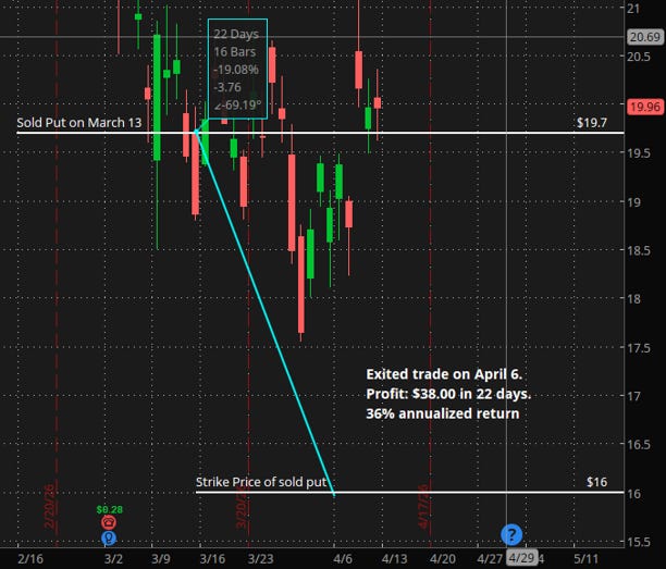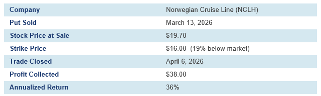 On March 13th, with NCLH trading at $19.70, I sold the $16.00 put — a 19% buffer below the market price — and collected premium for a trade targeting 36% annualized. The stock never came close to threatening our strike. By April 6th, with the position sitting well in profit, I made the call to close it early.